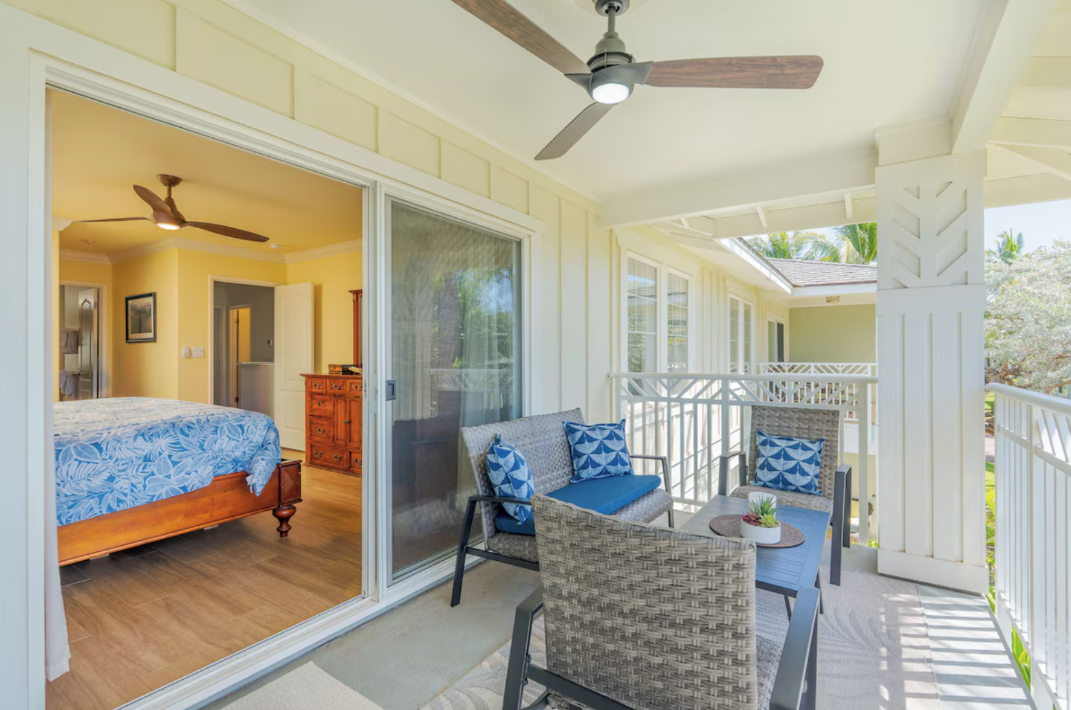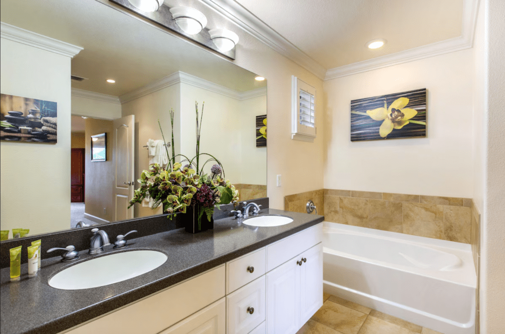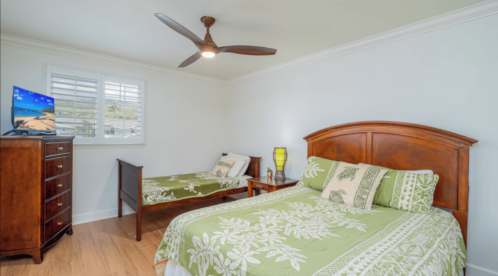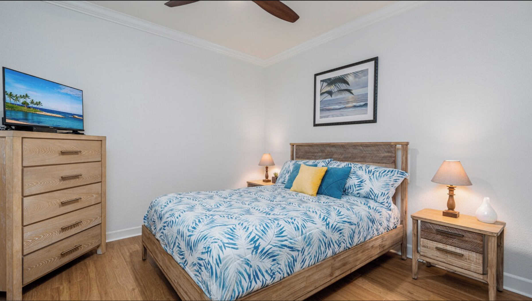 The 2nd floor Primary suite has a plush King bed, a large TV in the armoire, and a beautiful ensuite bathroom with a large tiled walk-in shower, double sinks, and a private soaking tub. The upstairs lanai is located via a sliding door off the primary bedroom. Relax and enjoy the beautiful view of the green space from above.