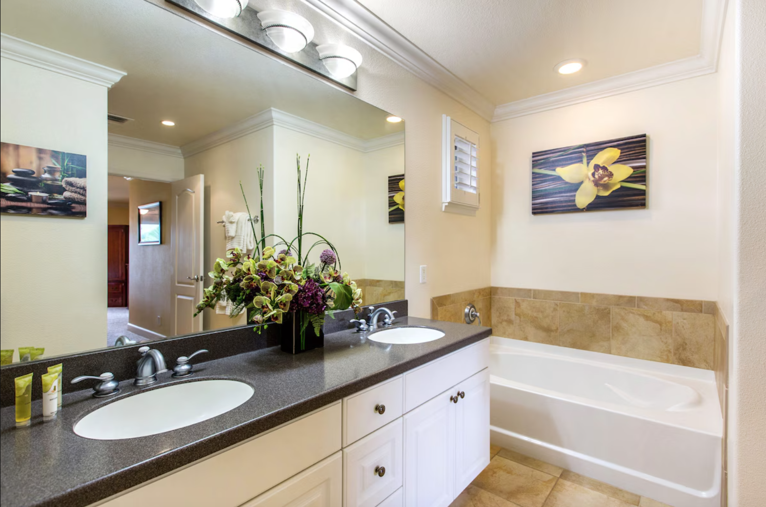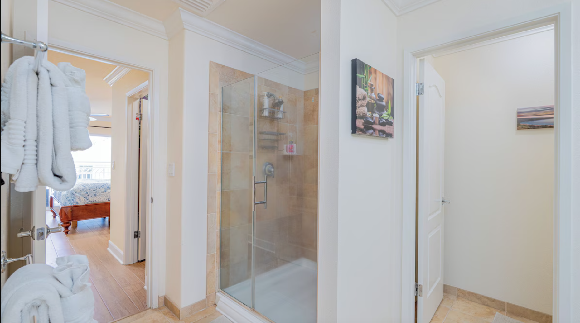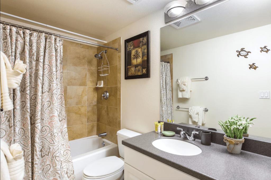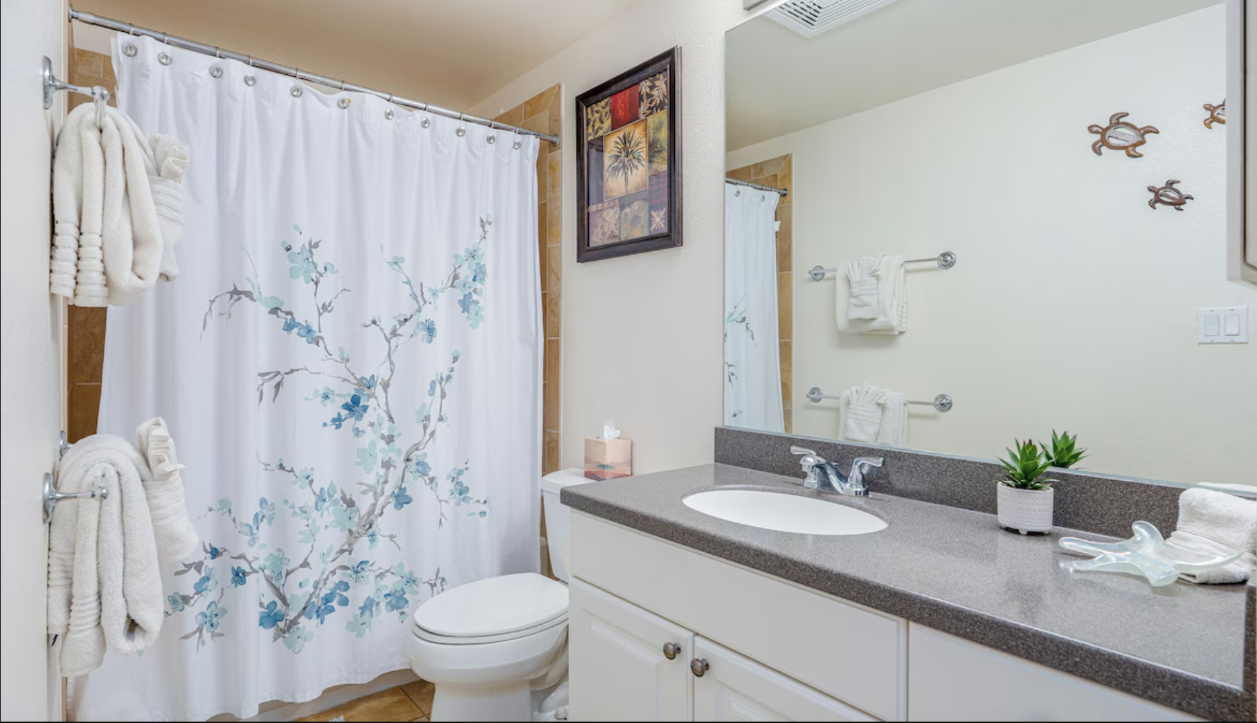 The second upstairs bedroom has a Queen and a twin bed, all with high-quality linens. There is a 34′ smart TV for your enjoyment. The bathroom just outside the door has a tub/shower combo. Then the third bedroom, located conveniently on the first floor, has a plush queen-sized bed and a 34′ smart TV. This room is very private and has a full-size bathroom outside the door.
