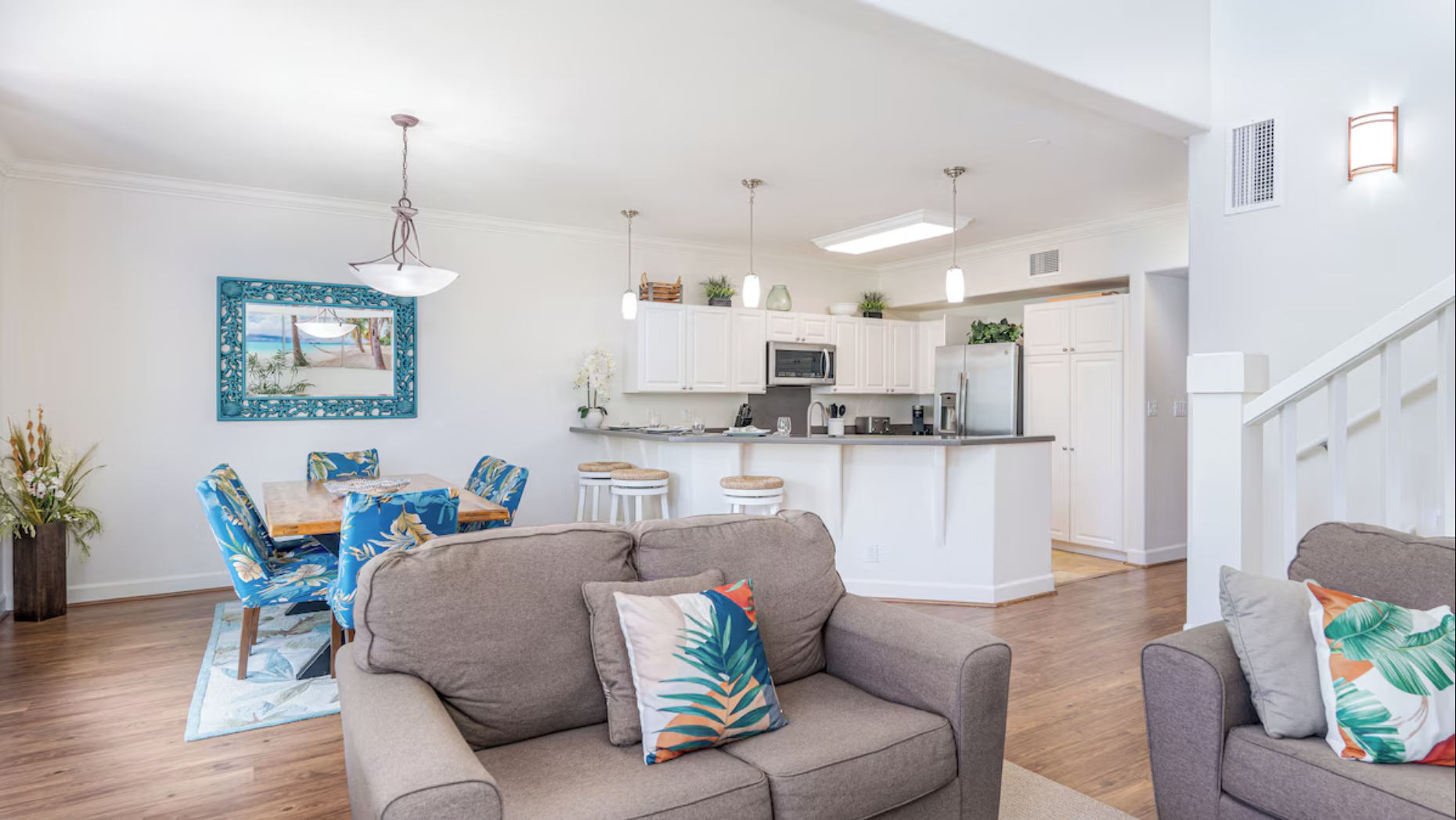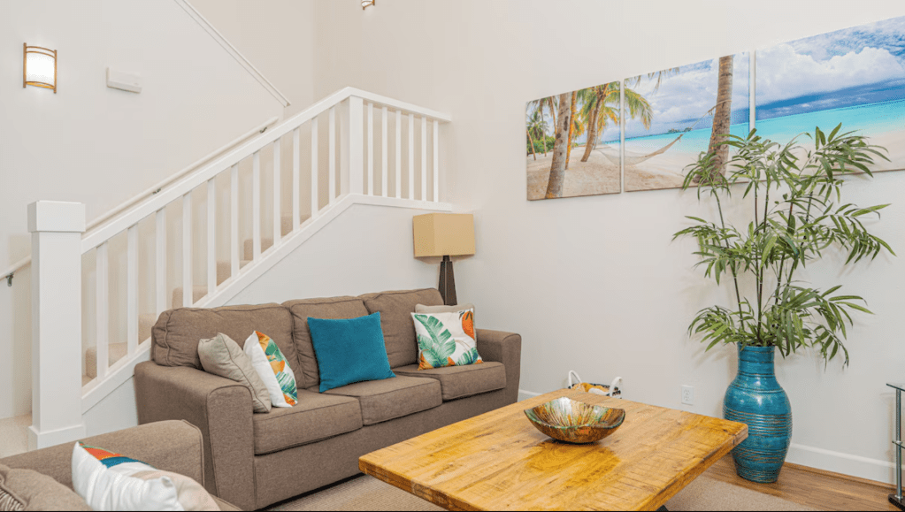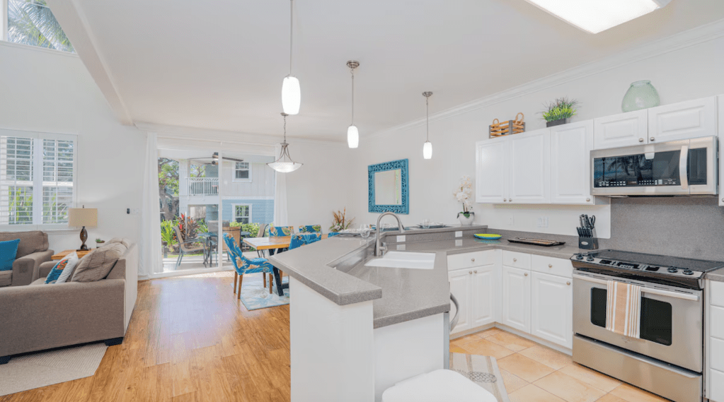 The great room on the first floor is a cozy gathering place with a large living room, high ceilings, a 50-inch smart flat-screen TV with cable/Wi-Fi, a dining area with a large dining table, fully equipped kitchen with all stainless appliances, and a breakfast bar with additional seating. The ground level patio opens to a view of a beautiful green and winding path to the pool. Two of the bedrooms are located upstairs.