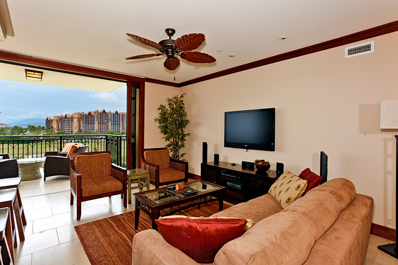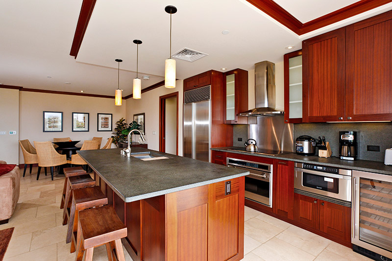 The large lanai spans the length of the living area and main bedroom, with great ocean views and bonus lanai entrance from main bedroom. The Villa boasts state-of-the art appliances and technology. Open up the pocket doors to the lanai, and the transition from indoor to outdoor living is seamless. Flat screen LCD televisions, broadband WiFi “Ultra” internet up to 400 mbps, and a fully equipped kitchen offer all the comforts of home.